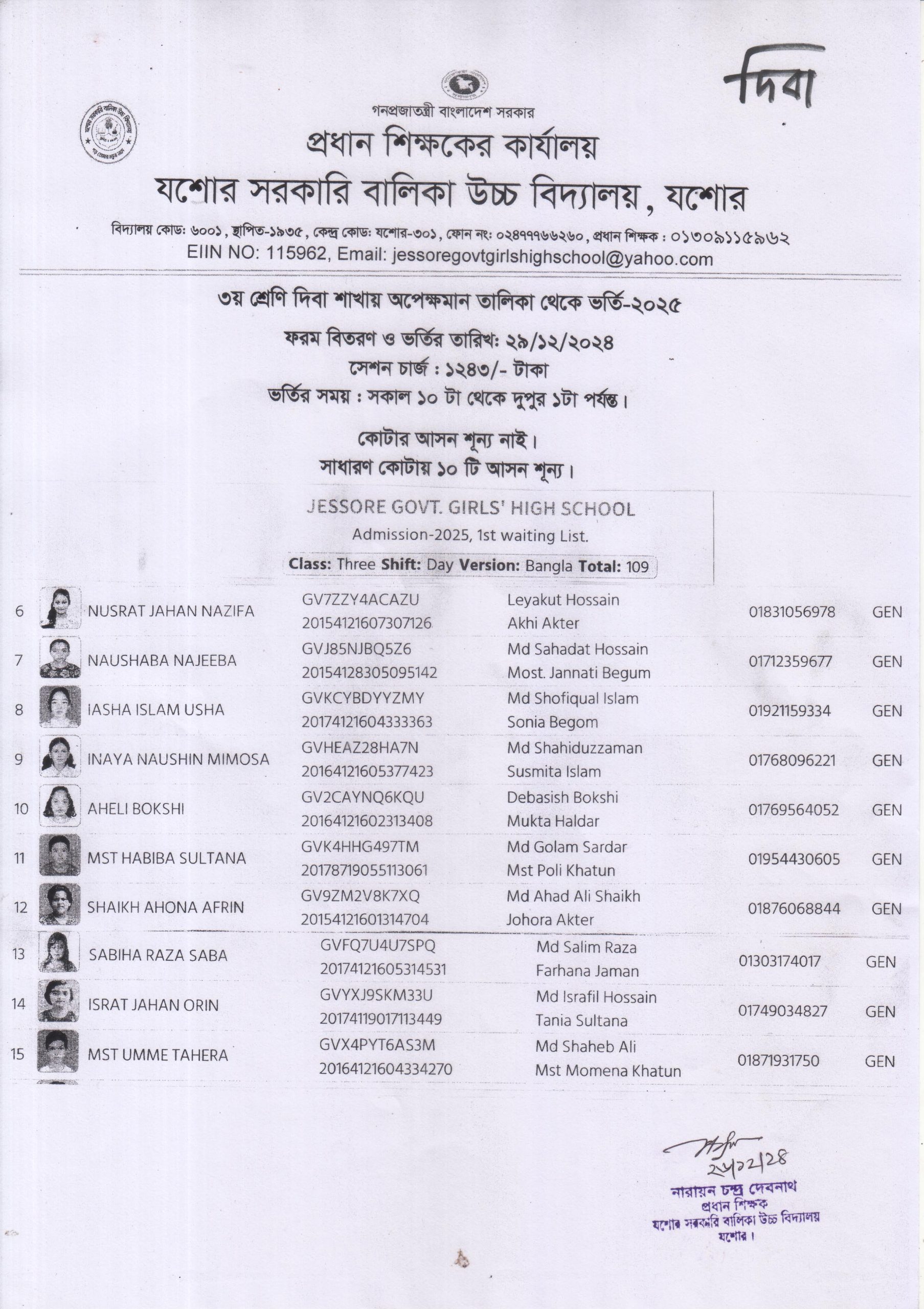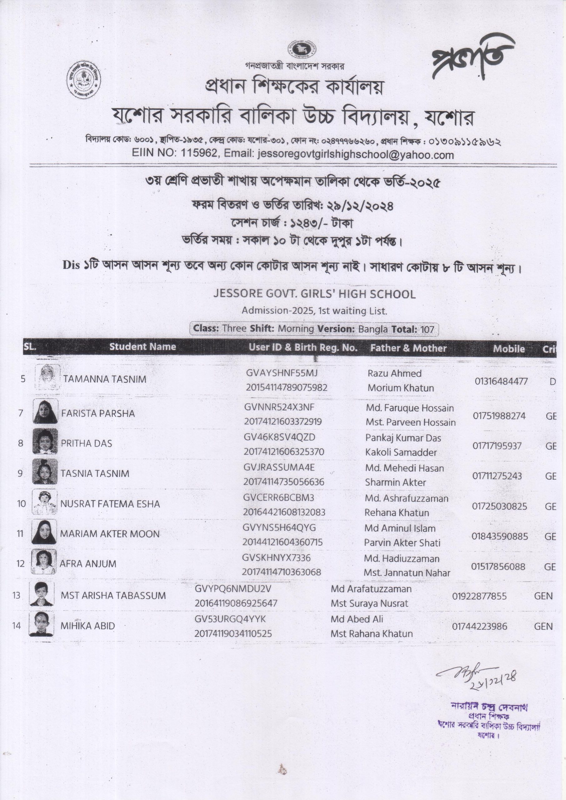৩য় শ্রেণি অপেক্ষামান তালিকা থেকে ভর্তি-২০২৫ (প্রভাতী ) |